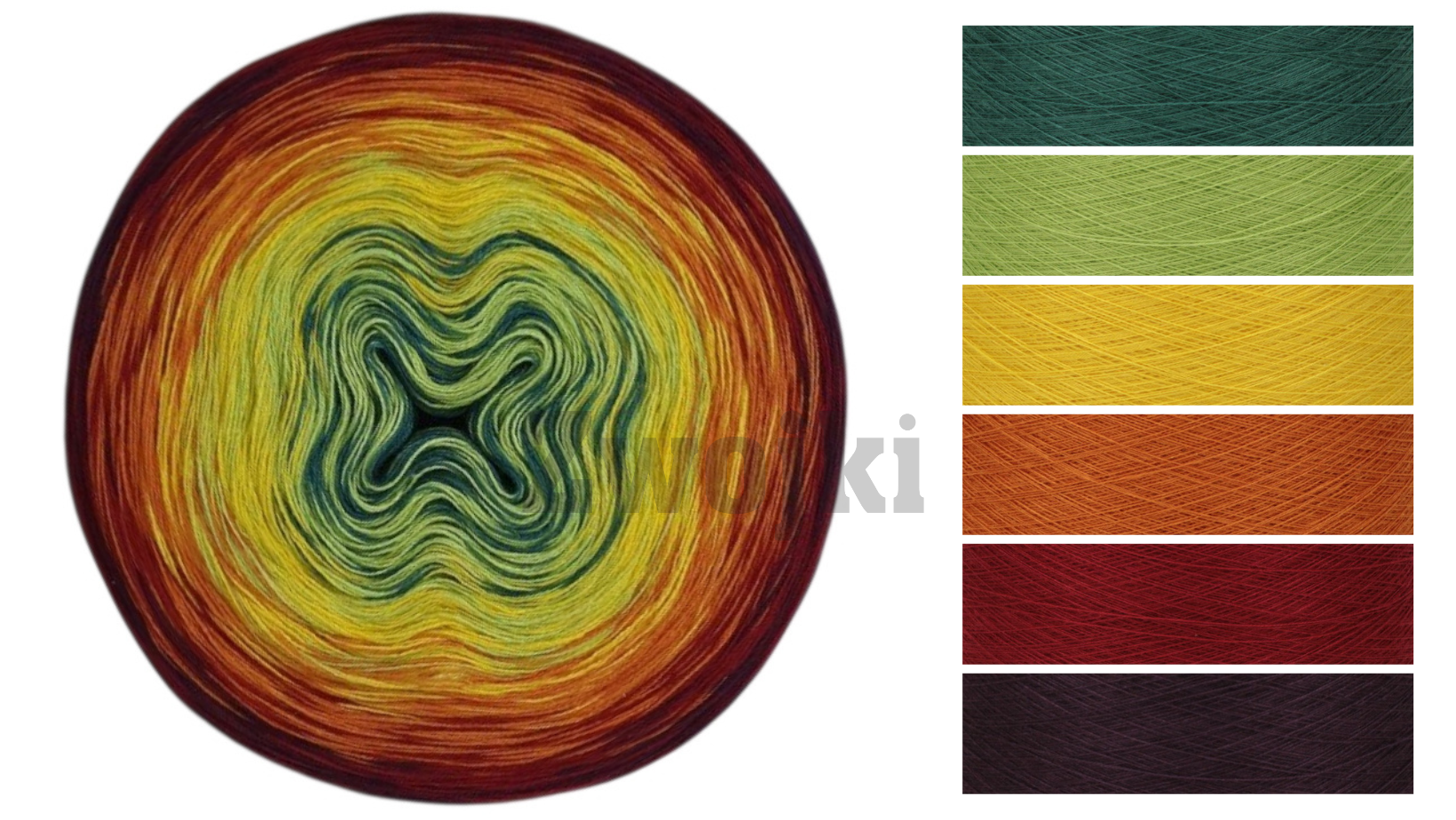 Kolory w motku: ciemny szmaragd/jasna zieleń/słoneczko/koniak/burgund/bakłażan