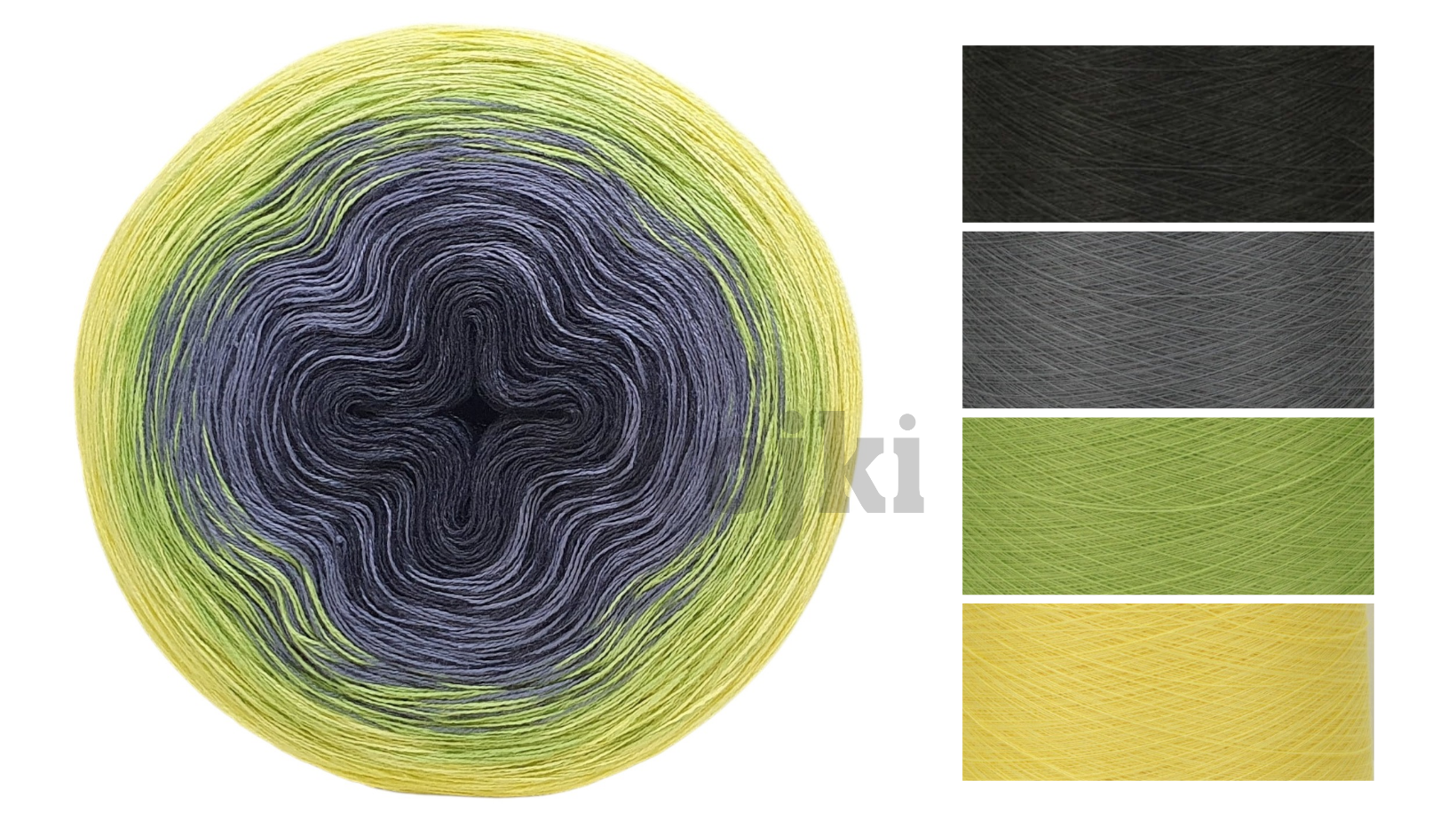 Kolory w motku: ciemny szary/średni szary/jasna zieleń/żółty