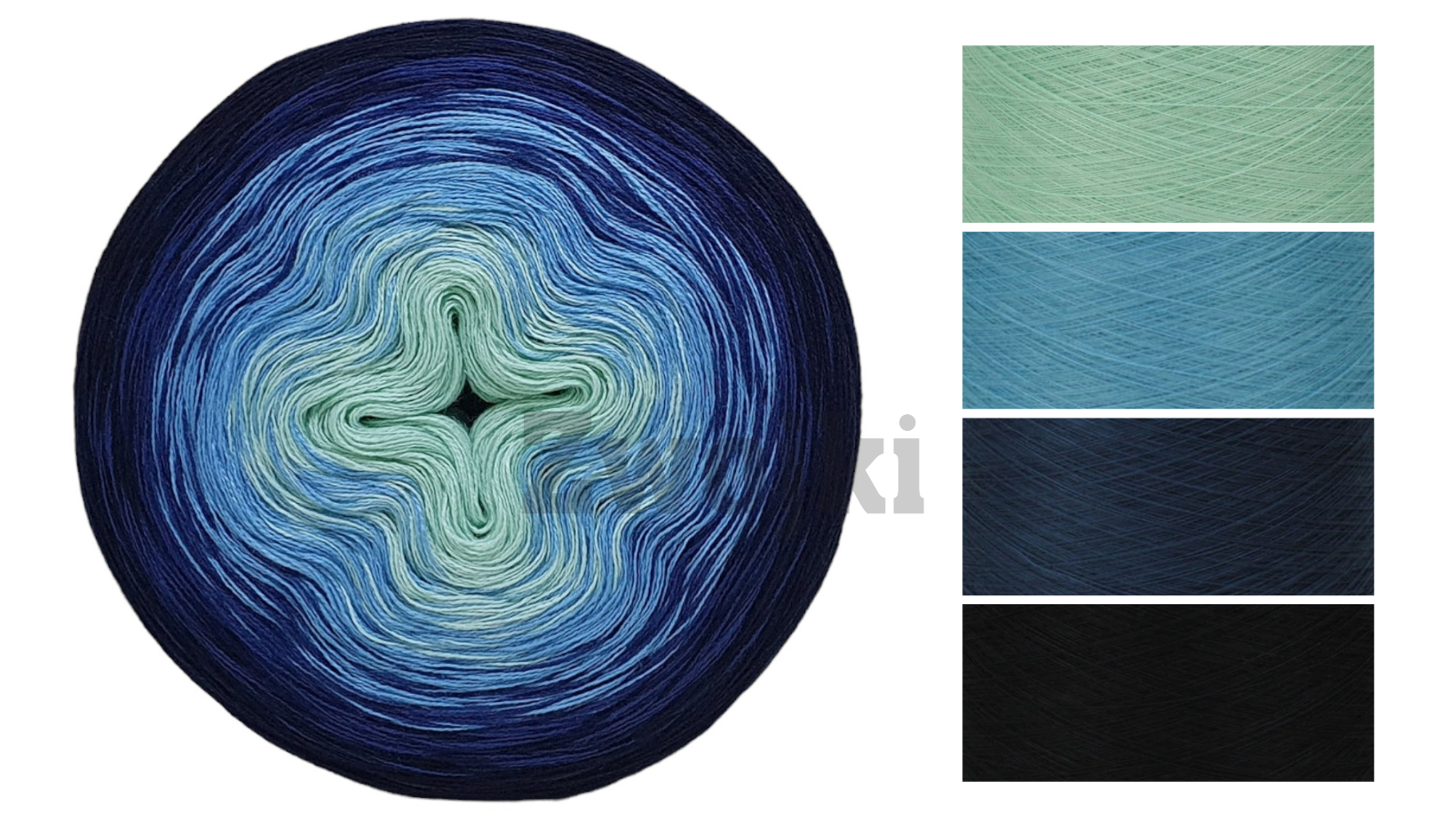 Piękny gradient kolorów nawijany jest ręcznie z 3 lub 4 nitek - zależnie od podjętego wyboru. Zwojki posiadają możliwość wybrania rodzaju nawinięcia (Less oraz standardowe przejścia kolorów) oraz wybrania koloru, który znajdzie się w środku motka.