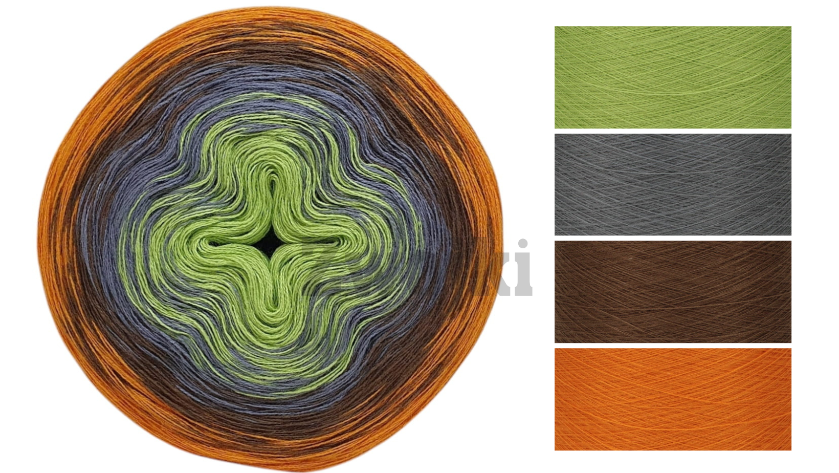 Kolory w motku: jasna zieleń/średni szary/orzech/pomarańcz