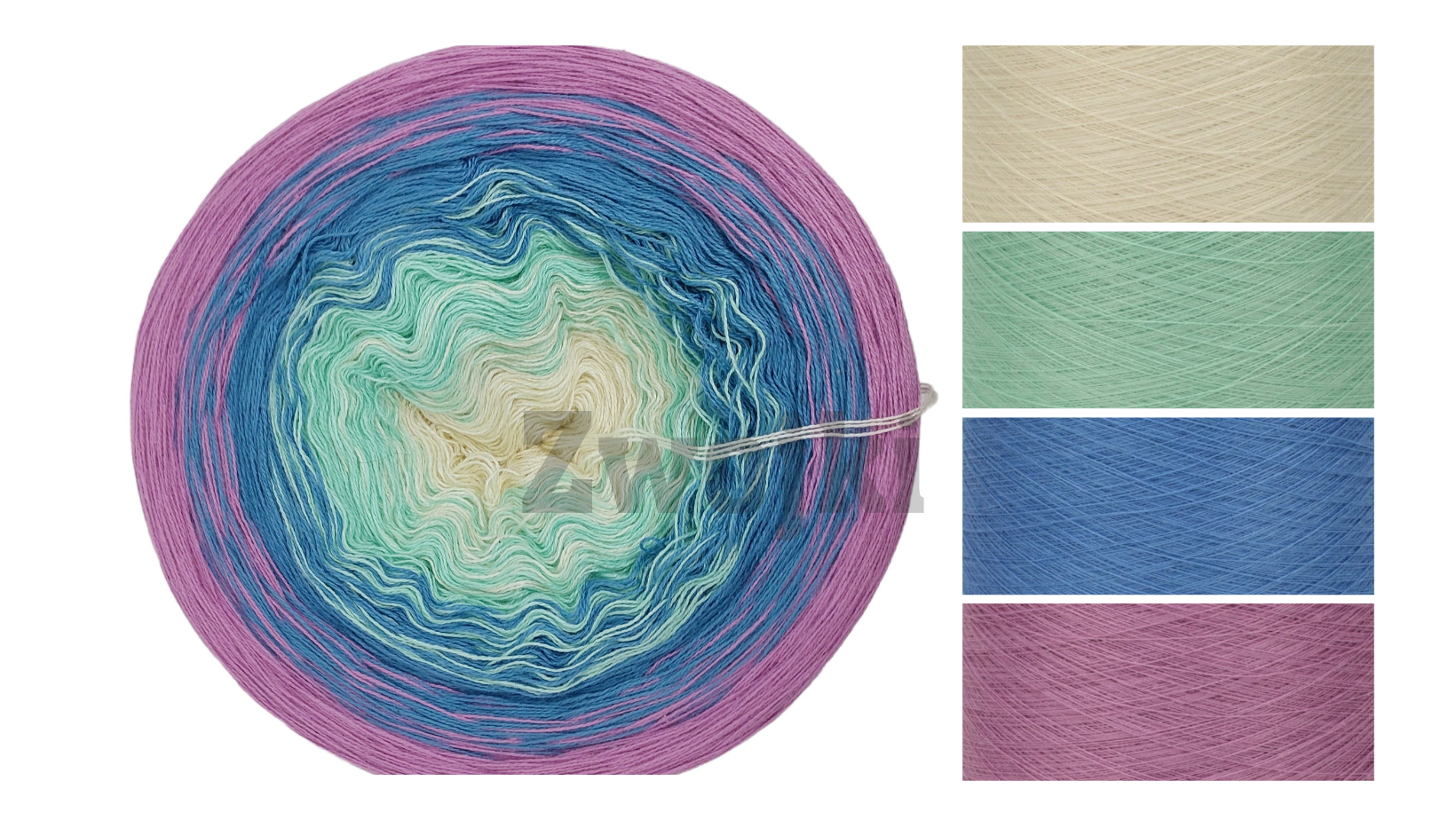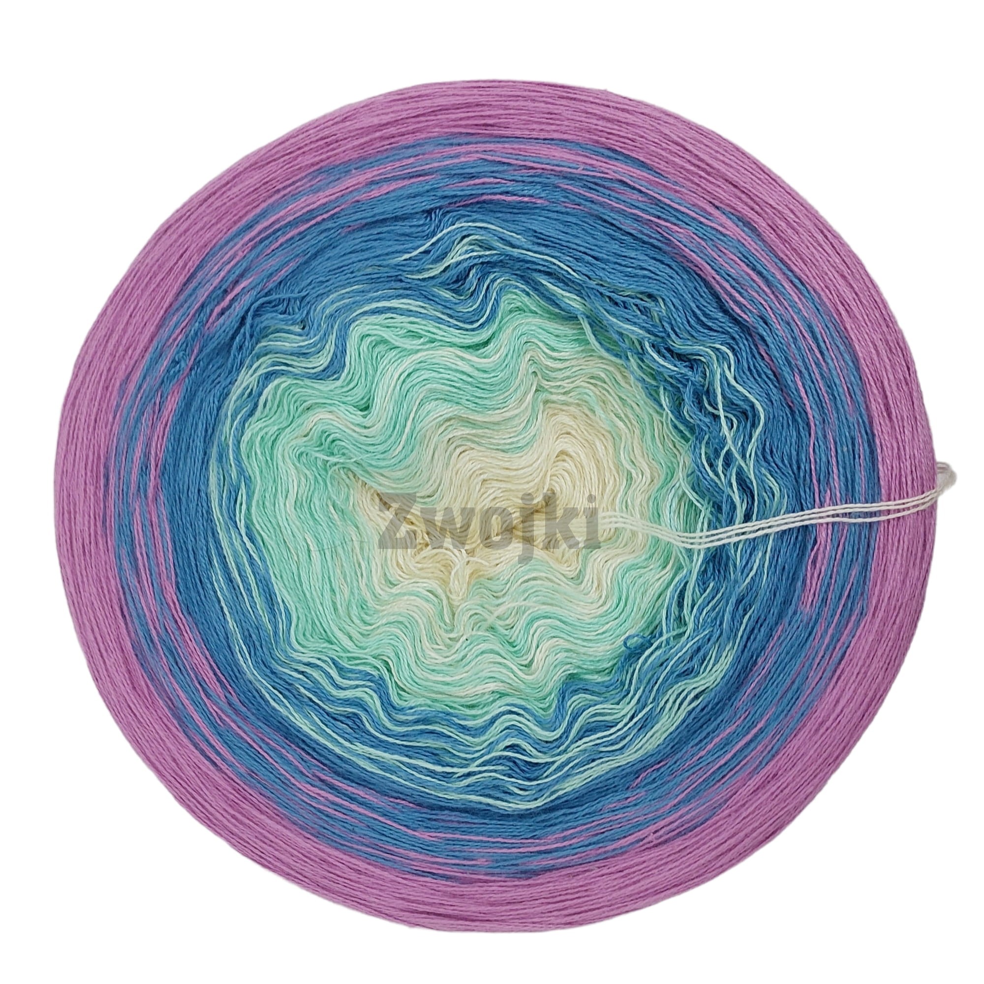Piękny gradient kolorów nawijany jest ręcznie z 3 lub 4 nitek - zależnie od podjętego wyboru. Zwojki posiadają możliwość wybrania rodzaju nawinięcia (Less oraz standardowe przejścia kolorów) oraz wybrania koloru, który znajdzie się w środku motka.