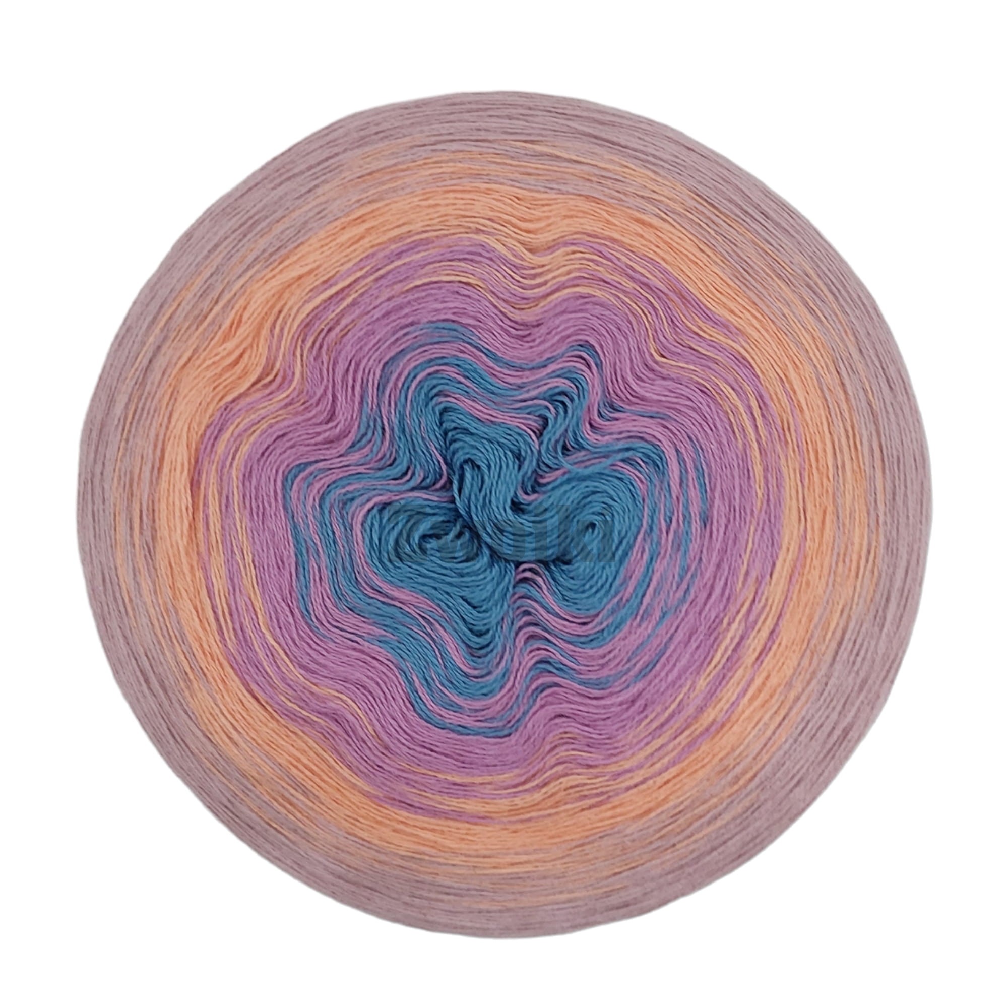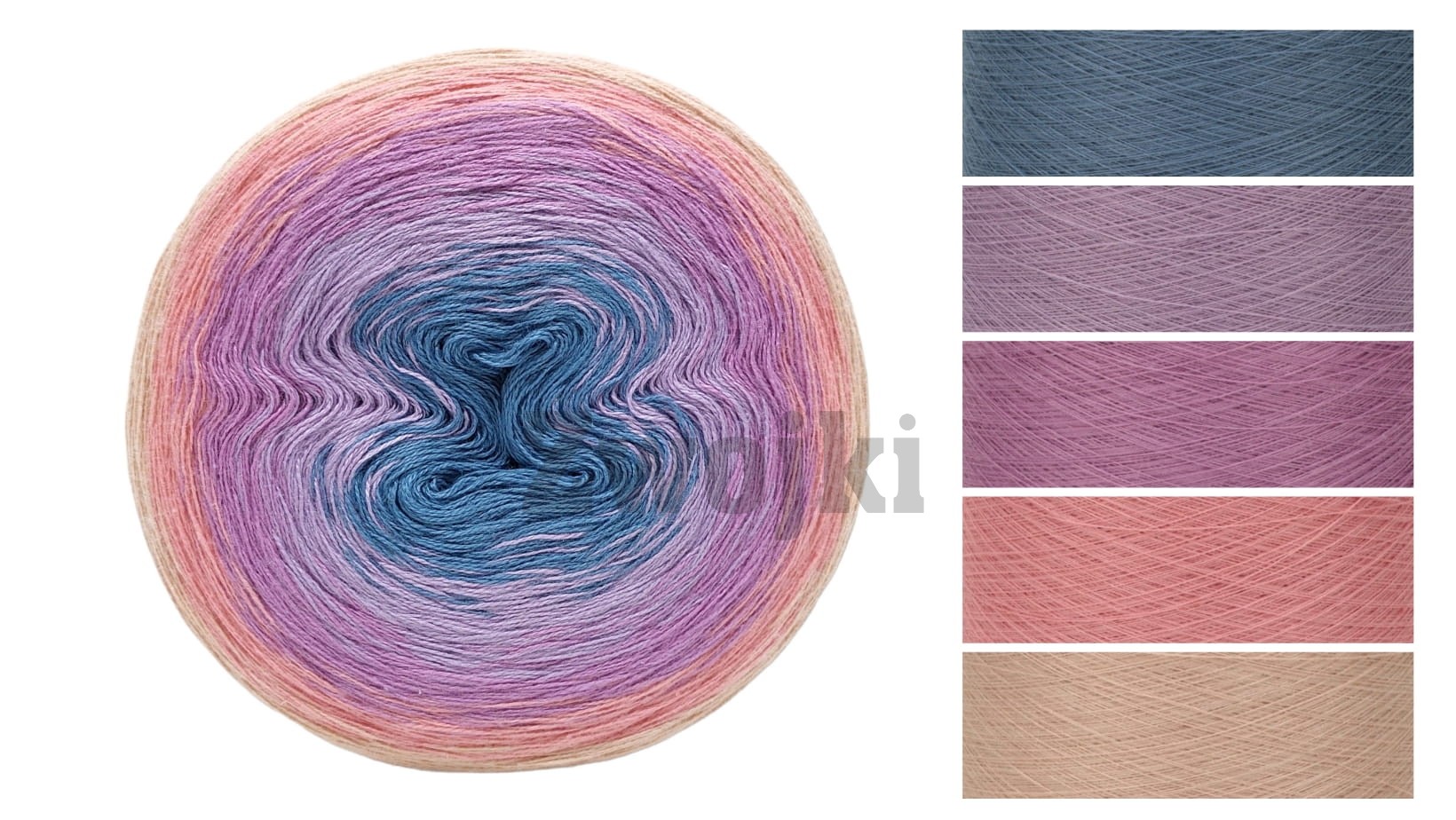 Piękny gradient kolorów nawijany jest ręcznie z 3 lub 4 nitek - zależnie od podjętego wyboru. Zwojki posiadają możliwość wybrania rodzaju nawinięcia (Less oraz standardowe przejścia kolorów) oraz wybrania koloru, który znajdzie się w środku motka.