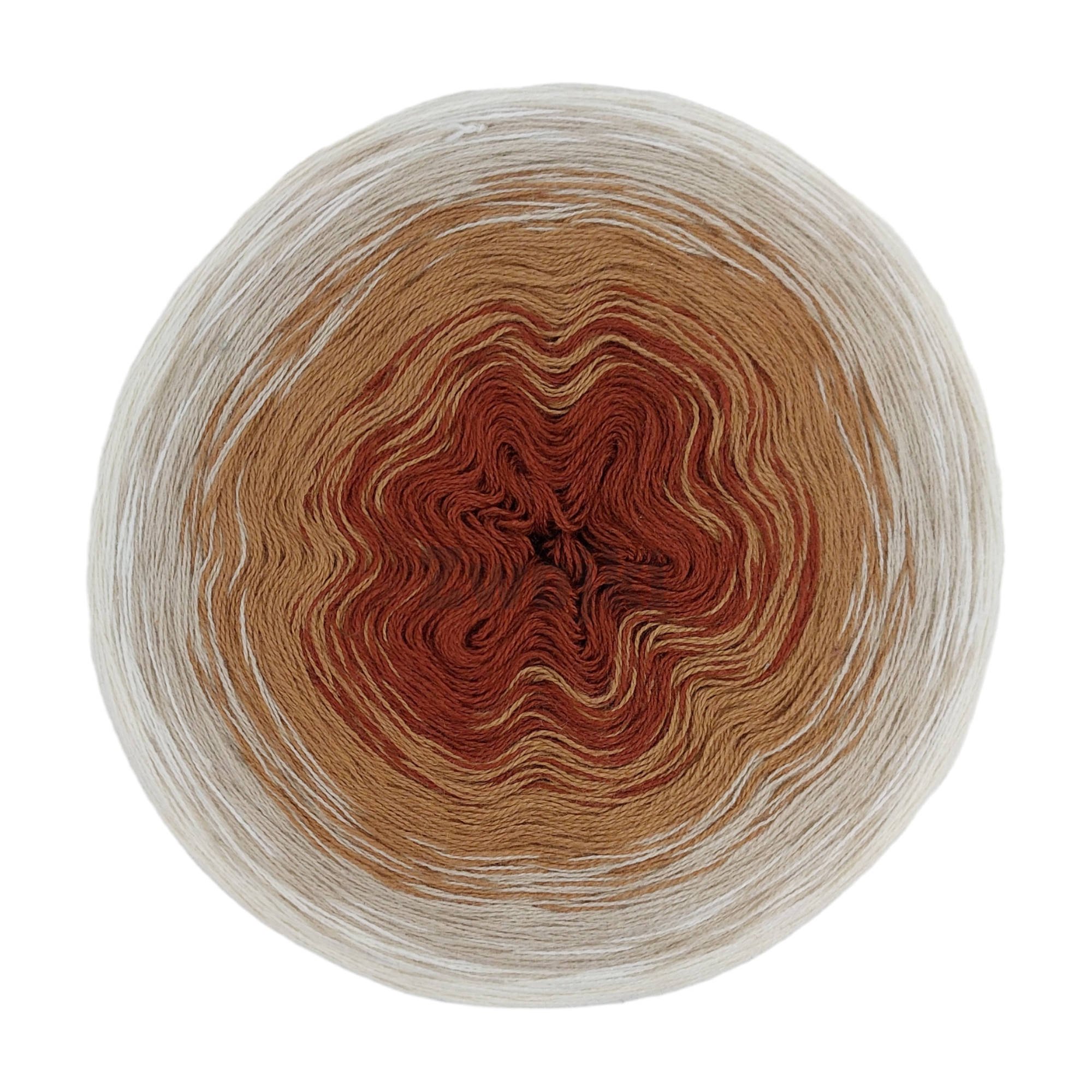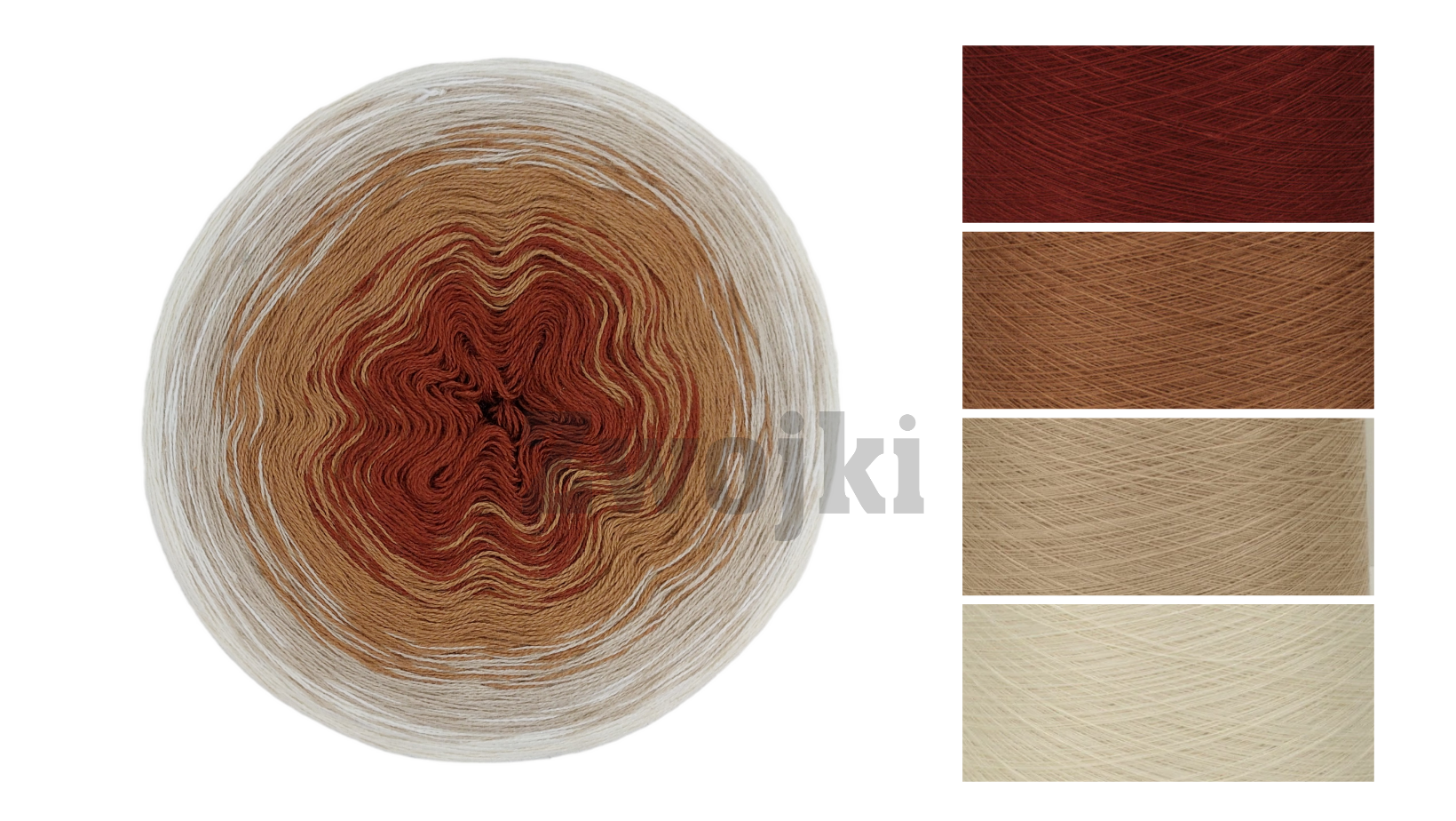 Piękny gradient kolorów nawijany jest ręcznie z 3 lub 4 nitek - zależnie od podjętego wyboru. Zwojki posiadają możliwość wybrania rodzaju nawinięcia (Less oraz standardowe przejścia kolorów) oraz wybrania koloru, który znajdzie się w środku motka.