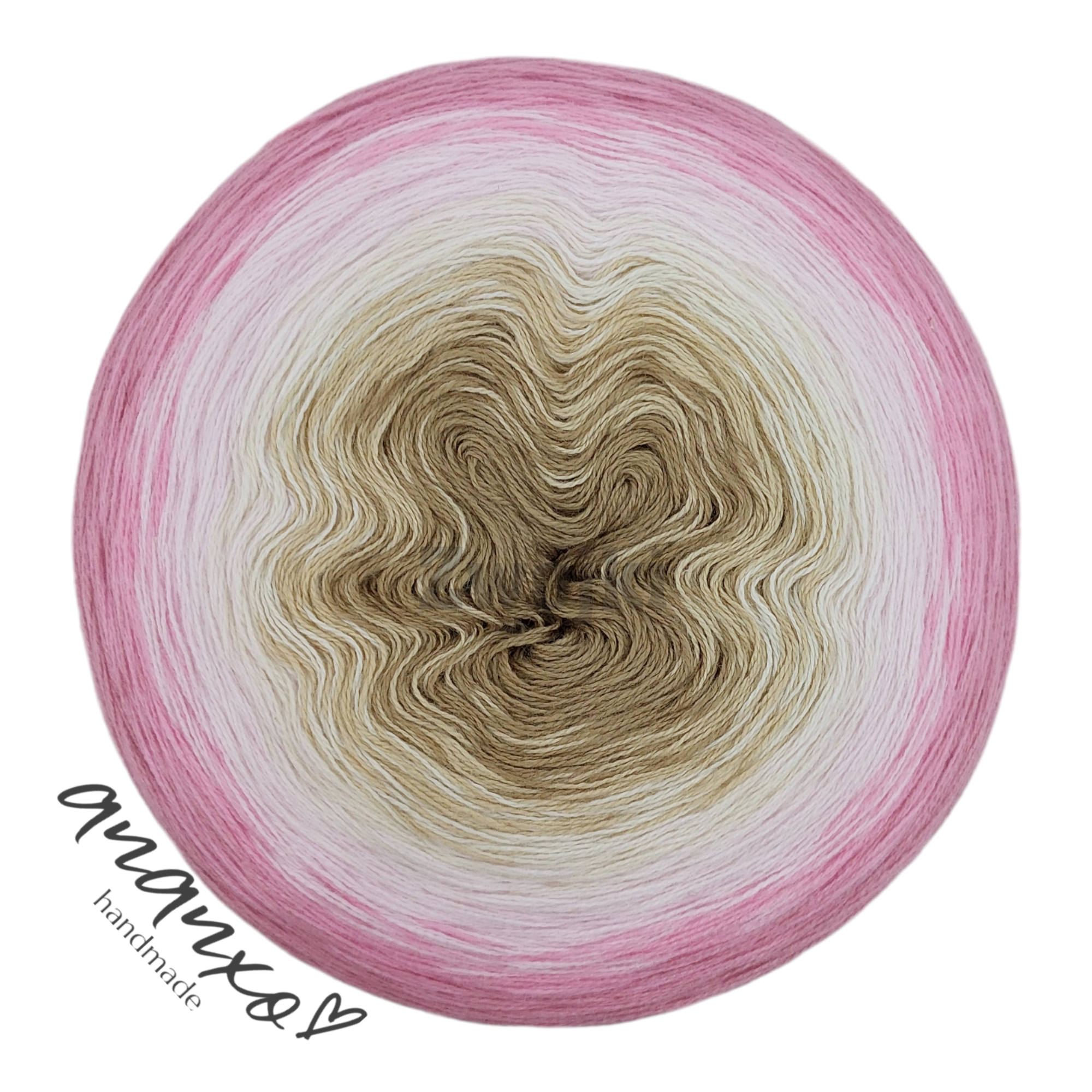 Piękny gradient kolorów nawijany jest ręcznie z 3 lub 4 nitek - zależnie od podjętego wyboru. Zwojki posiadają możliwość wybrania rodzaju nawinięcia (Less oraz standardowe przejścia kolorów) oraz wybrania koloru, który znajdzie się w środku motka.