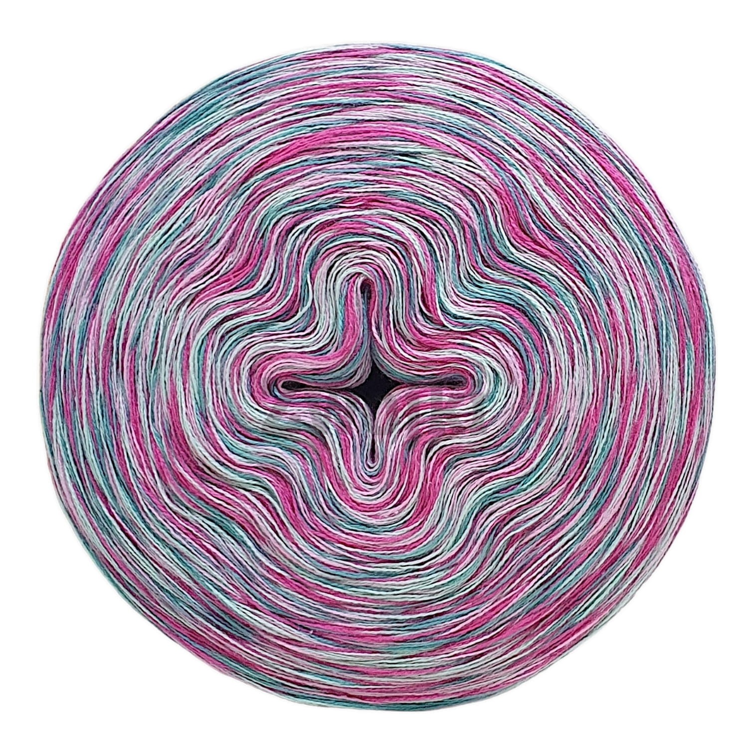 Nawijany ręcznie, składający się z 4 nitek różnego koloru, które nie są skręcone.