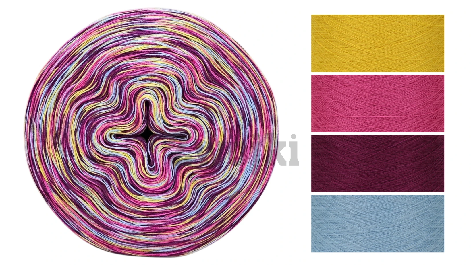 Nawijany ręcznie, składający się z 4 nitek różnego koloru, które nie są skręcone.